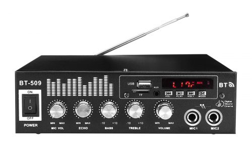 $41.19Quick ViewPackage Included:1 x Audio Amplifier1 x Remote Control1 x ManualSpecifications:Color: BlackModel: BT-509Weight:1450gInput voltage: AC 110-220V/ DC12V(in car)Plug: EU plug(sent with an adapter according to your country)bluetooth: SupportSpeaker impedanc:4-16ohmSNR(Signal/Noise Ratio);-90DBNInput power:12Volts DC5A AC220VInput impedance:47KFrequency:20Hz-20KHzInput sensity:025mV-220mVOutput power:R.M.S 20WFeatures:-Mini HIFI digital bluetooth audio power amplifier.-Built-in LCD display, with backlight function.-U disk, MP3 format play, support bluetooth wireless connection.-Supports FM stereo radio.-Two microphone input slot, karaoke system in your home or in car.-With treble, bass, and volume control, very easy to use.-Low distortion supplies a clearer, stronger and more powerful sound.-Two main channel output.-With Remote control function.-DC/ AC power in, Suitable foe home or your car.