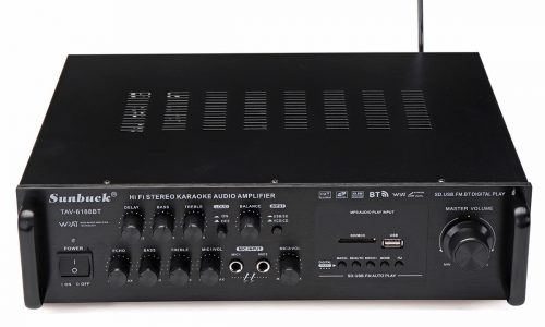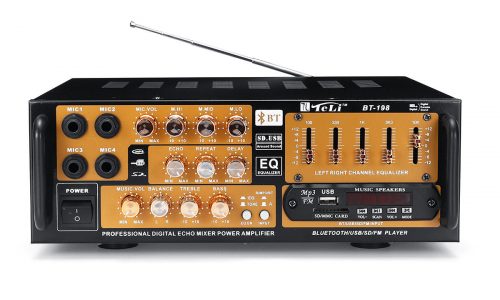 $95.42Quick ViewFeature:1. SD Card, U disk, MP3 format play, support bluetooth wireless connection.2. With treble, bass, and volume control, very easy to use.3. Low distortion supplies a clearer, stronger and more powerful sound.4. Two main channel output.5. With Remote control function.6. DC/ AC power in, Suitable foe home or your car.7. Mini HIFI digital bluetooth audio power amplifier.8. Built-in LCD display, with backlight function.9. Supports FM stereo radio.10. Support breakpoints.Built-in two USB port.11. Two microphone input slot, karaoke system in your home or in car.Specification:Colo: BlackInput voltage: AC 220V/ DC12V(in car)bluetooth: SupportPeak power: 1000W+1000WLoad impedance: 16SNR: 80 dbDistortion rate: 0.01%Frequency: 20Hz-40KHzPackage Included:1 X Audio Stereo Amplifier1 X Remote Control1 X Manual