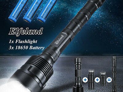 $20.18Quick ViewPackage Contents:1 x Elfeland 3xT6 LED Flashlight3 x 18650 BatteryDescription:-Made of high quality aluminum alloy, this flashlight is sturdy and durable enough for long time daily using-Lamp base: , high power LED. With a lifespan of up to 100,000 hours or more, no need to consider-Brand: Elfeland-Emitter BIN: T6-Color BIN: White-Quantity of Emitters: 3-Battery Configurations: 2 x 18650 rechargeable battery or 3 x 18650 rechargeable battery-Voltage Input: 12.6 V Max.-Switch Type: Clicky / Clickie-Switch Location: Tail-cap-Modes: 5-Mode Arrangement: HiMidLowFast-StrobeSOS-Brightness: 500 lumens maximum brightness (manufacturer rated)-Lens: Coated Glass Lens-Reflector: Aluminum Textured/OP Reflector-Size: 290( length ) x 55.6( head diameter ) x 27( body diameter ) (when use 2 pcs tube for 3 pcs 18650 battery) ;224( length ) x 55.6( head diameter ) x 27( body diameter ) (when use 1 pcs tube for 2 pcs 18650 battery ) ;-Color: Black18650 Rechargeable Battery :Model: 18650Voltage: 3.7VBattery Capacity: 3000mAhSize(mm): 64.5 (length) x 18.2 (body diameter)Your 18650 battery will be shipped at random in color, RED or Blue.