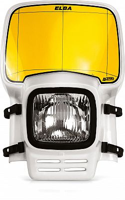 Retro look headlight with high resistance plastic headlight (polycarbonate) for enduro bike with conventional forks, Bulb 12 V 35 W 3 position, Easy mounting with 4 elastics, Yellow sticker added for competition race number.