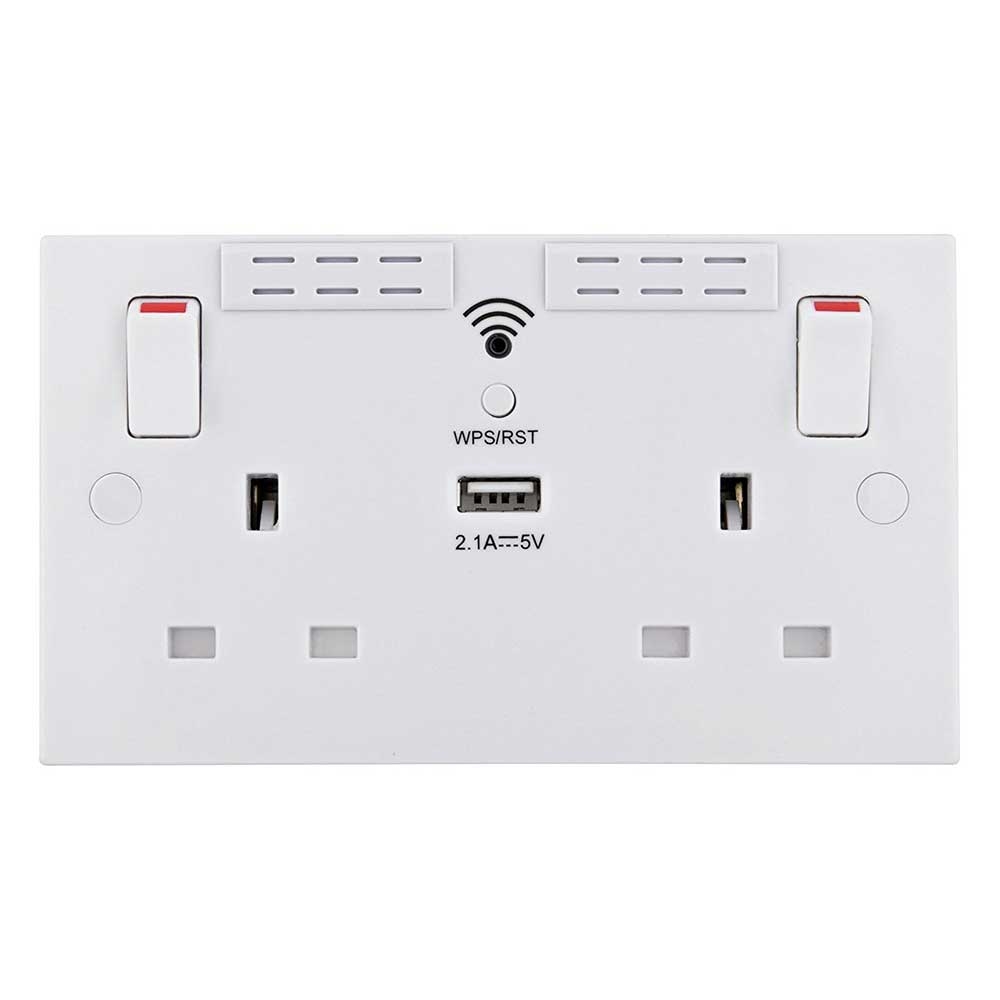 Definitely the new way to power your gadgets and mobile devices while keeping your standard 13A sockets free for other things. Featuring 1x 2.1A 5V type A USB sockets, perfect for your iPhone, iPad, tablets, games consoles and cameras.SpecificationsSetupWPS – Wi-Fi Protected Setup® or via web browserWireless Band2.4ghz Single BandWireless SpecificationWireless standards 2T2R 2.4GHzIEEE 802.11n (up to 300Mbps)IEEE 802.11g (up to 54Mbps)IEEE 802.11b (up to 11Mbps)SecurityWi-Fi Access passwordWi-Fi Protected Access®:256-bit WPA –PSK256-bit WPA2-PSK256-bit WPA/WPA2-PSKMinimum System Requirements802.11 b/g/n 2.4GHz wireless router with broadband internet connectionAndroid 3.0, Android 4.X, IOS 5 or aboveWindows® XP 32(SP3 or greater),Windows Vista® 32/64, or Windows 7 32/64, Windows 8 32/64, Windows10 32/64; or Mac OS® X v10.5 or aboveInternet Explorer® 10.0, Firefox® 20, Google Chrome™ 25, or Safari® 5.1Wiring Specification2 gang switched socket with outboard rockersRed rocker indicators (printed)Terminal capacity: 3 x 2.5mm², 3 x 4.0mm² or 2 x 6mm²Minimum mounting box depth 25mmTwin earth fitted as standard to allow a double earth facility for installations requiring high integrity protective connection Ref. BS 7671:2008Supplied with 2 x 32mm screws and screw coversMaterialWhite moulded square edge profileScrew covers for sleek appearanceBlue/Amber LED indicatorDimensions86mm x 146mm x 10mm (front plate)(H x W x D)Fits a standard 25mm wall box