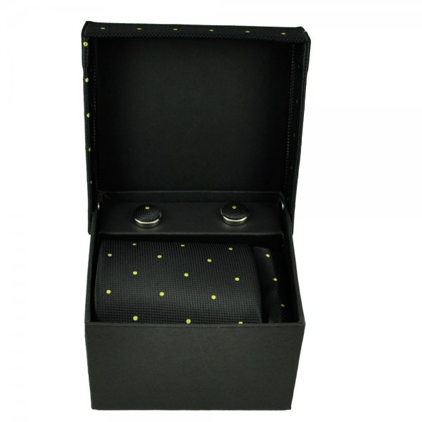 Black & Yellow Polka Dot Men’s Tie, Hanky & Cufflinks Set High Quality Fabric Luxury Gift Box Set