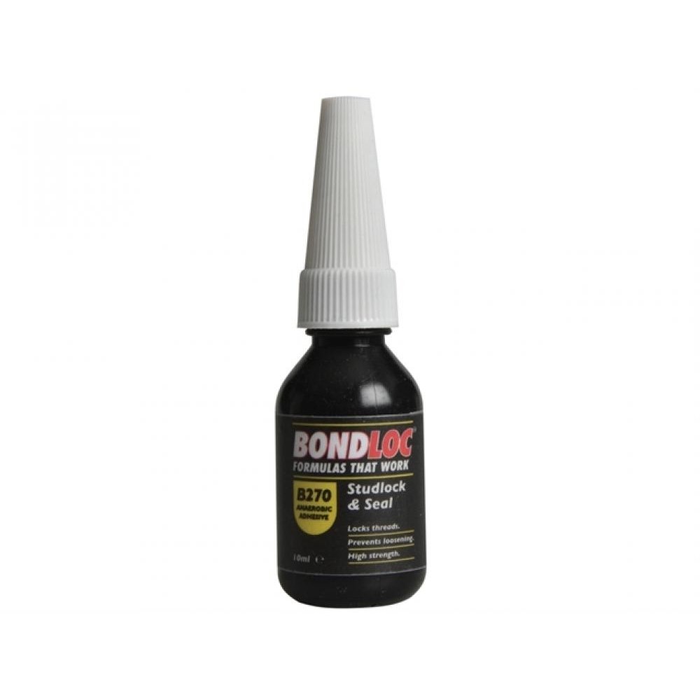 Bondloc B270 Studlock is a permanent green coloured general-purpose adhesive for permanent threaded assemblies. B270 locks studs up to 1in, sealing against leakage and corrosion. It is chemical resistant, resisting fuels, lubricants and most industrial liquids and gases. It eliminates double nutting and/or welding of critical assemblies. It also permits reduced casting thickness and ultimate lightness, reduced assembly stress and eliminates cracked castings due to interference fit stresses. Specifications: Resin: Dimethacrylate.Colour: Green.Fixture Speed No Activator: 10 mins.Fixture Speed With Activator: 5 mins. Viscosity: 500 cps.Gap fill: 0.25mm.Flash Point: >100°C.Shelf Life :12 month min.Specific Gravity: 1.06.Max Operating Temperature: -55°C to + 150°C. Cured Performance: Full Cure Time: 12 hours.Cure Time with good % of final strength: 2 hours.Typical Breakaway Strength DIN : 40 N.m (25/55).Typical Prevailing Strength DIN : 55 N.m (45/70).Typical Breakaway ISO 10964: 26 N.m (16/36).Typical Prevailing ISO 10964: 36 N.m (22/50).Bondloc Studlock High Strength Threadlocker Size: 10ml.