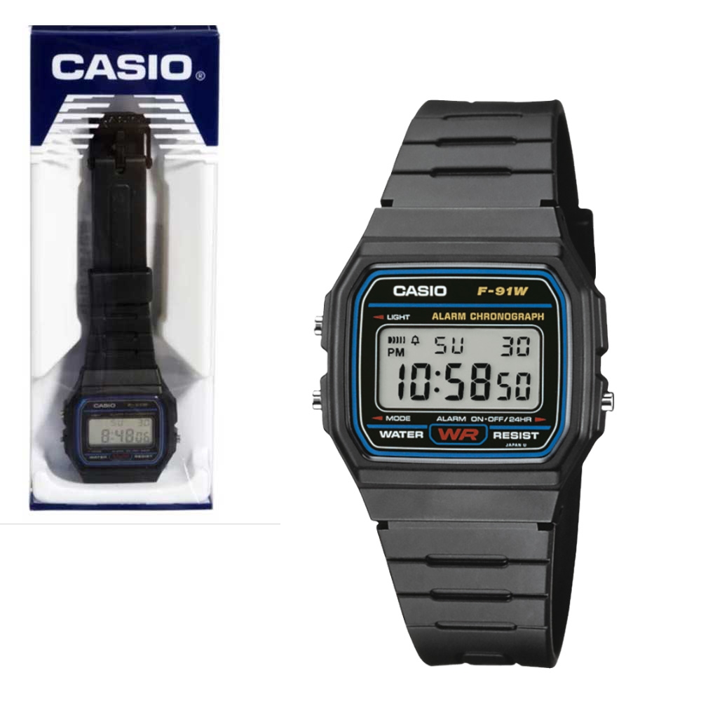 A tried and true style great for casual wear – and a great price.This Casio classic watch has great features, including its daily alarm, hourly time signal and auto calendar. It means you will never need to worry about missing an appointment again.Microlight: A built-in light illuminates the watch face from the side. Stopwatch function: Measure elapsed time, split time and final time with 1/100-sec accuracy. The watch can measure times of up to 1 hour.Daily alarm: Reminds you of events that recur every day, by emitting an audible signal at the set time. In addition, an adjustable alarm alerts you when every full hour has elapsed.Automatic calendar: Once set, the automatic calendar always displays the correct date.12/24-hour timekeeping: Times can be displayed in either a 12-hour or 24-hour format.Resin case and band: Natural resin is the ideal material for wrist straps thanks to its extremely durable and flexible properties.7 Years – 1 Battery: The battery supplies the watch with sufficient energy for approx. seven years. It takes a CR2016 battery – please see product links for the great value batteries that we sell.Specifications Model: F-91W-1YER Water resistant to DIN 8310 / ISO 2281 – e.g. minor splashing. Any greater water contact should be avoided. Accuracy: +/- 30 sec seconds per month Type of battery: CR2016 Dimensions: Approx. H38.20mm x W33.20mm x D8.50mm 2-year manufacturer’s limited warrantyWhat’s included 1 x Casio classic men’s casual water resistant digital wrist watch with resin band 1 x CR2016 battery (pre-installed ready to use but replaceable)
