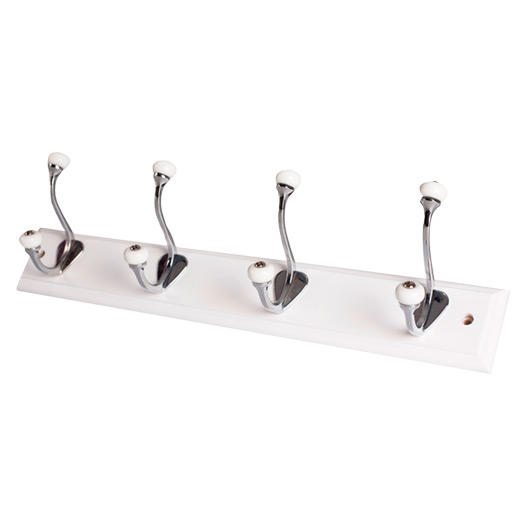 Ceramic Ball End Hat & Coat Hooks, 4 x Bright Chrome Hooks on White Rail