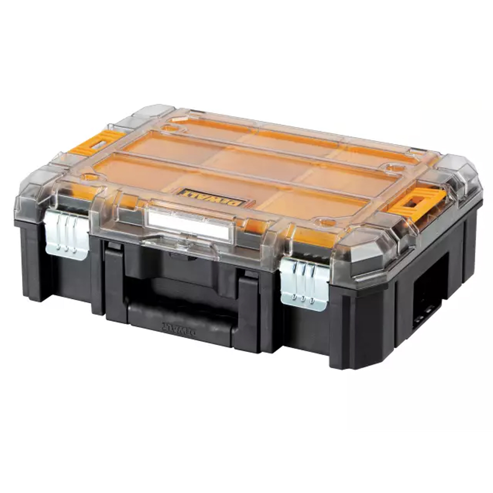 The DeWalt T-STAK Toolbox is a mobile modular storage system that allows you to quickly and easily change the combination of tools you take to work. These cases stack effortlessly together via the specially engineered side clips, enabling easier storage and transportation. The organiser has two large and five small removable storage cups for storing small parts and accessories. Its unique heavy-duty lid design locks all compartments in place for secure storage. Dimensions: Width : 440mmDepth : 314mmHeight : 145mm