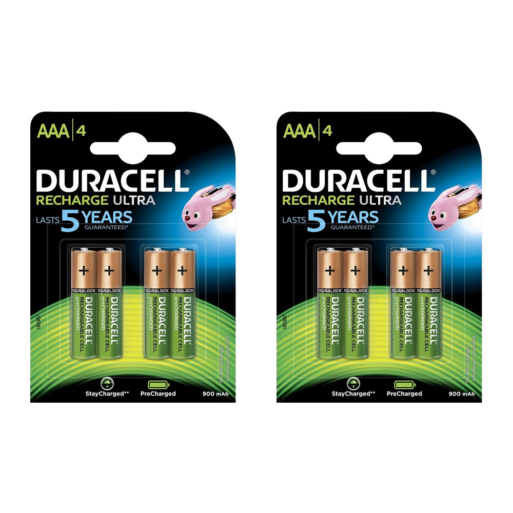 Duracell Recharge Ultra batteries are the leading battery manufacturer’s most powerful rechargeable batteries – making them ideal for power hungry devices like digital cameras or wireless game controls.They come pre-charged, so are ready to use out of the packet and are guaranteed to last 5 years or 300 recharges (which ever is sooner). Duracell’s Duralock technology keeps more of the power locked in for longer, which means your batteries stay charged for up to one year when not in use.  It means they will stay charged up to 12 months after charging, keeping up to 80% of their charge when not in use.With a capacity of 850mAh, these batteries are ideal for high drain and regularly used items. You could take 250 pictures in a digital camera on one charge or enjoy 8 hours use of  a wireless games control with these batteries.SpecificationsCapacity: 900mAhPre-chargedGuaranteed to last for 5 years or 300 recharges (whichever is sooner)Duralock technology to lock in power for longerRetain up to 80% charge up to 1 year after chargeWhat’s in the Box? Duracell Precharged Rechargeable AAA Batteries (900mAh) – 8 Pack (x 2 retail 4 packs)