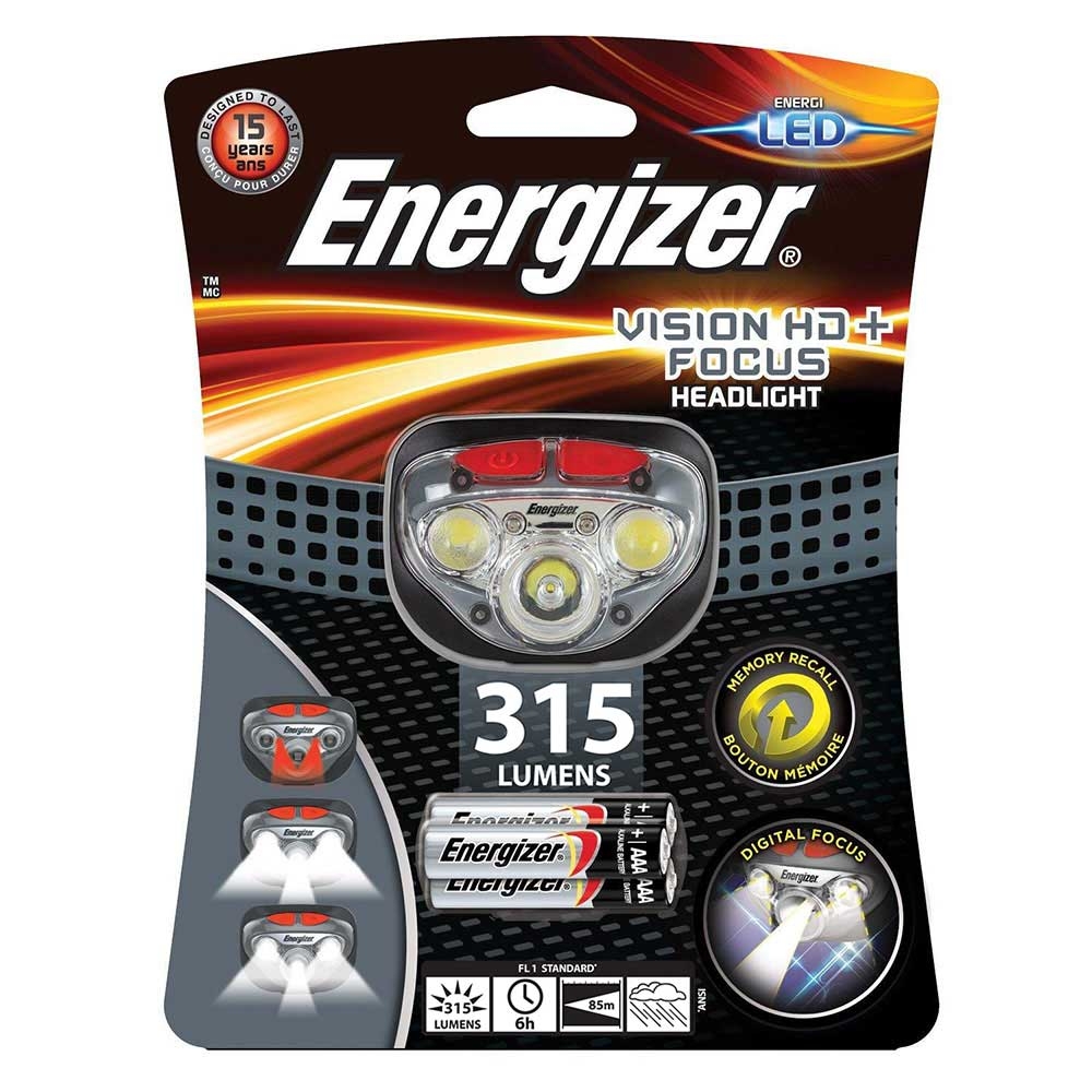 This powerful and robust headlight is ideal for hiking, camping, running, fishing outdoor activities or jobs where you need both hands such as mechanics and more. It’s water resistant to IPX4 standard and has shatter proof lenses on top of being impact resistant up to 1 metre.And with a beam distance of up to 85 metres, a light output of up to 315 lumens and a pivoting head function, you can choose where you most need the light.The Energizer Vision HD+ Focus headlight is up to four times brighter than standard LED technology, and offers white spot, white flood and red for night vision modes. There’s also digital focus and memory recall, with dimming.The buttons are easy to use, while the elastic headband is fully adjustable for maximum comfort. This headlight is designed to last up to 15 years and compes supplied with 3 x AAA Energizer Max alkaline batteries.Specifications Light output: Up to 315 lumens Beam distance: Up to 85 metres Water resistant: IPX4 rating  Impact resistant: Up to 1m Pivoting function: Yes Light modes: white spot, while flood and red for night vision. Fully adjustable non-slip strap: Yes Shatter proof lenses: Yes Easy to use buttons: Yes Digital light focus: Yes Memory recall: Yes Run time: Up to 6 hoursBattery powered: 3 x AAA batteriesWhat’s included 1 x Energizer Vision HD+ Focus headlight 3 x AAA Energizer Max batteries included