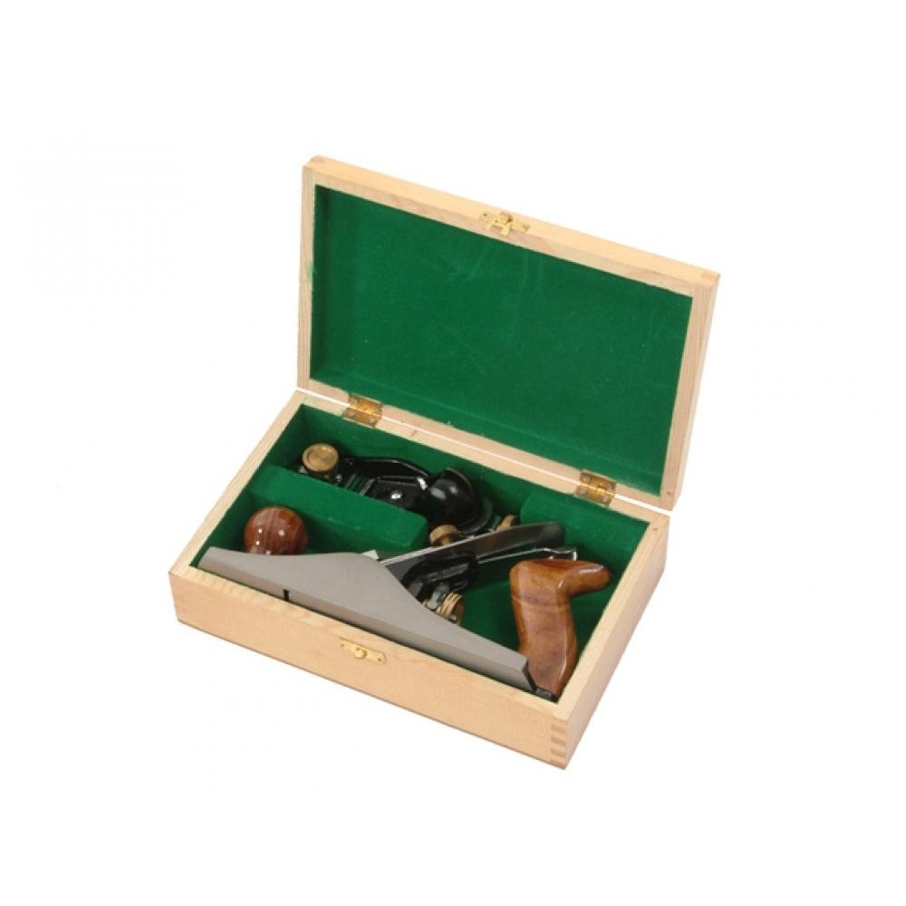 This Faithfull Plane Set comes in a wooden storage box and provides the essentials you need for planing wood: 1 x No.4 Smoothing Plane, designed for smoothing and final finishing. Made with a quality grey cast iron body for strength and stability with precision ground base and sides for flatness and squareness. Machined seatings eliminate movement and blade judder. A lever cap with a brass locking screw secures the blade assembly and enables easy release for sharpening. Wooden handles and guidance knobs maximise user comfort. A solid brass blade adjustment nut completes the appeal of these traditional tools. Cutter Width: 50mm.Overall Length: 250mm. 1 x 60.1/2 Block Plane has the plane iron set at 13.5°. It is particularly effective on end grain and plastic laminates. Block planes are designed for end grain work or in any situation where a single handed operation is required. The low angle cutter and fully adjustable mouth, from wide for coarse work to narrow for the fine shaving of awkward grain. Cutter Width: 35mm.Overall Length: 160mm.