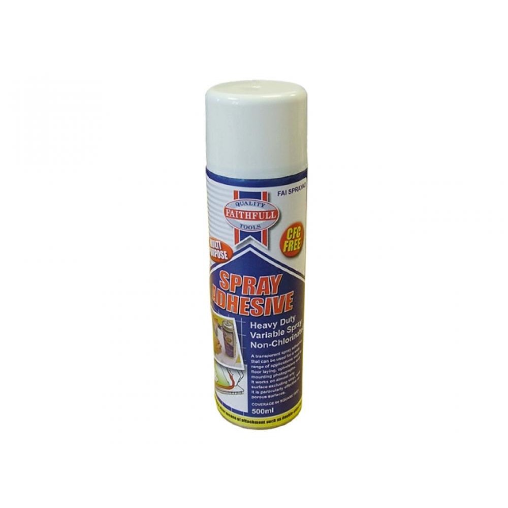 Faithfull spray adhesive is simple to use either inside or outside. When used inside, allow adequate ventilation during use and afterwards to remove all fumes. Spray adhesive replaces ordinary double sided tapes and can be used for a wide range of applications such as floor laying, upholstery and mounting photographs. Spray adhesive fixes almost all surfaces (excluding Vinyl). Make sure the surfaces you are joining are porous. Each 500ml can covers an area of 60 sq ft approximately (medium setting).