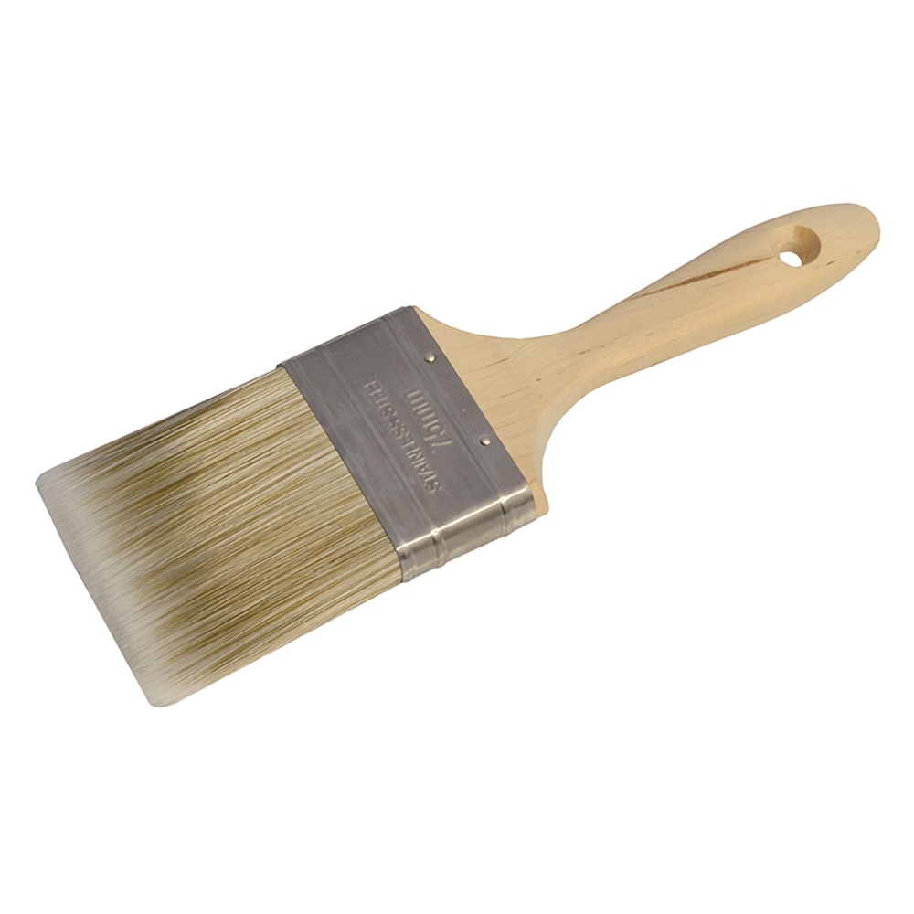 Faithfull Tradesman synthetic filament brushes are manufactured using a 100% blend of solid round tapered filaments with a chiselled top for better performance and ease when cutting in. A natural wood beavertail handle provides perfect grip and balance, making the brushes comfortable to use. The squared stainless steel ferrule helps retain an accurate head shape. These brushes will provide a good performance and can be used with all paint types. Size: 75mm (3in).
