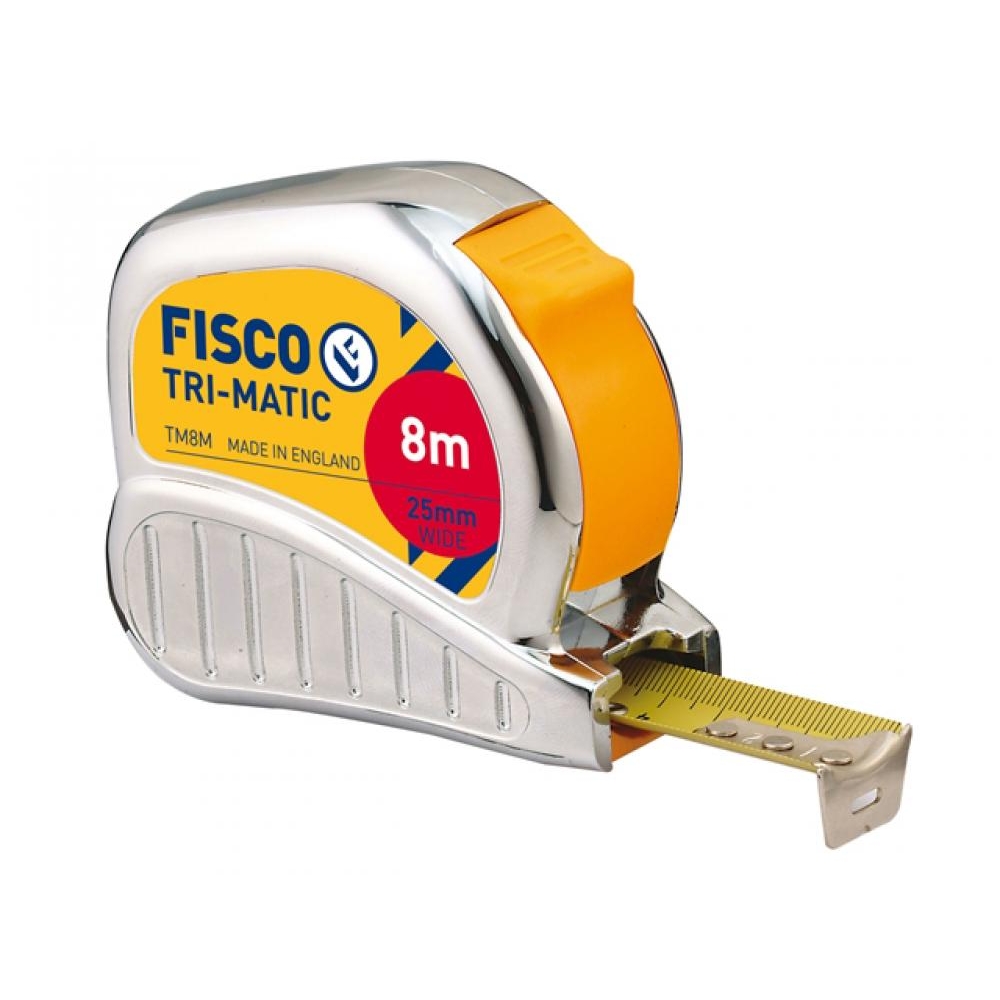 The Fisco TMC8M Chrome Tri-Matic Tape has a 13mm wide polyester coated steel blade with both metric graduations along its length. The markings are printed in two distinct colours on a high visibility bright yellow background for clear and simple measuring. Tripple rivet, self-zeroing end-hook with reinforcing plate. The tape is housed in a tough ABS case with a high quality chrome finish with a belt hook to the rear. The effective bump stop gives added blade and end-hook protection whilst the easy-to-operate positive lock minimises blade slip. Made In Britain.