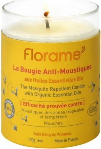 Effective protection against bothersome flies Florame Mosquito Repellent Candle uses a natural recipe to take mosquitoes’ and flies away wherever you are. Practical and efficient, this candle will be the ally of your evenings to repel mosquitoes and flies while spreading a sweet summer fragrance The Mosquito Repellent Candle consists of a complex of organic essential oils of Citronella, Lavandin, Peppermint, Palmarosa, Eucalyptus and Lemongrass, to the properties of the organic Andiroba vegetable oil. Even the wick is made from organic cotton. Proven efficacy against : The standard mosquito Culex pipiens The Mediterranean mosquito Aedes aegypti The tropical mosquito Anopheles stephensi The fly domesticates Musca domestica