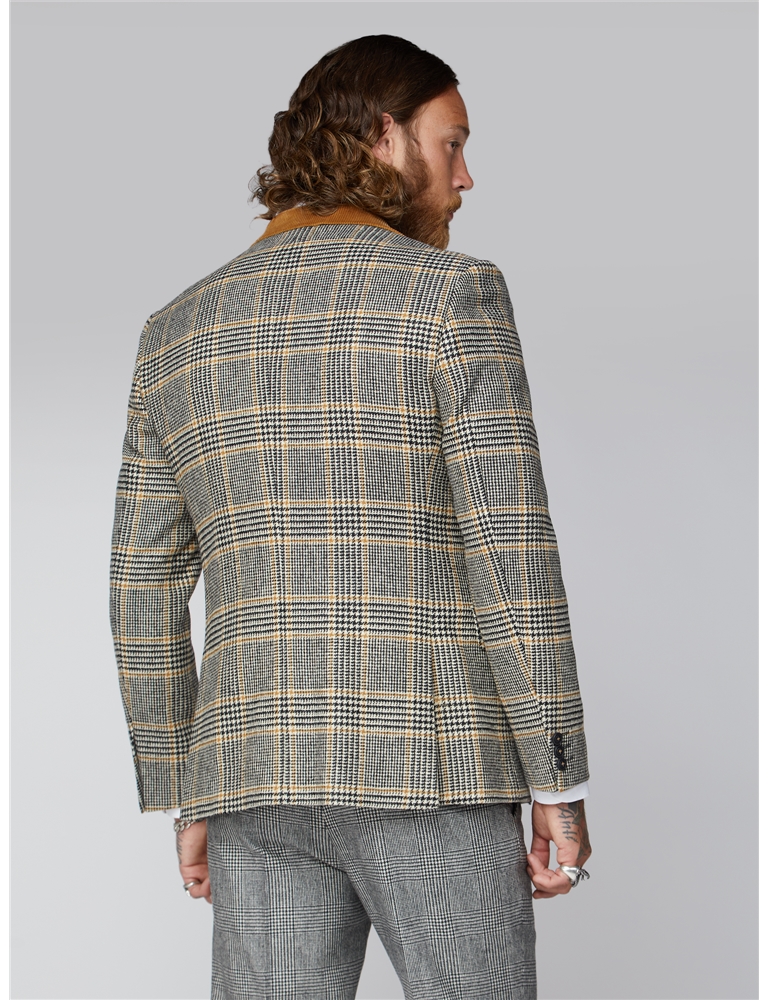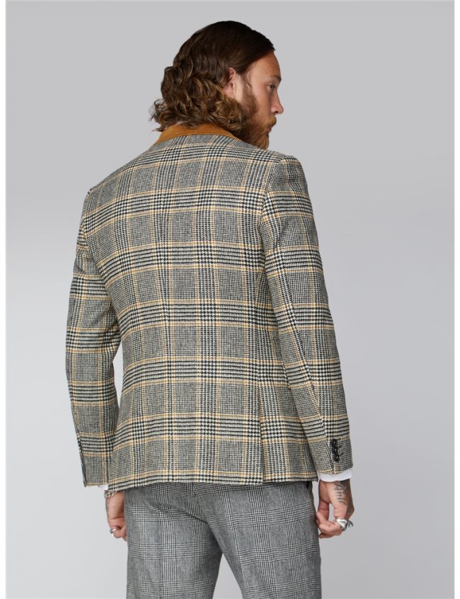 A brand new variation on classic heritage fabrics This mens grey black and brown checked suit jacket nbsp loaded with detail with gold contrast elements in a colourful warm checkered design suit The Allaire steams out of the ordinary