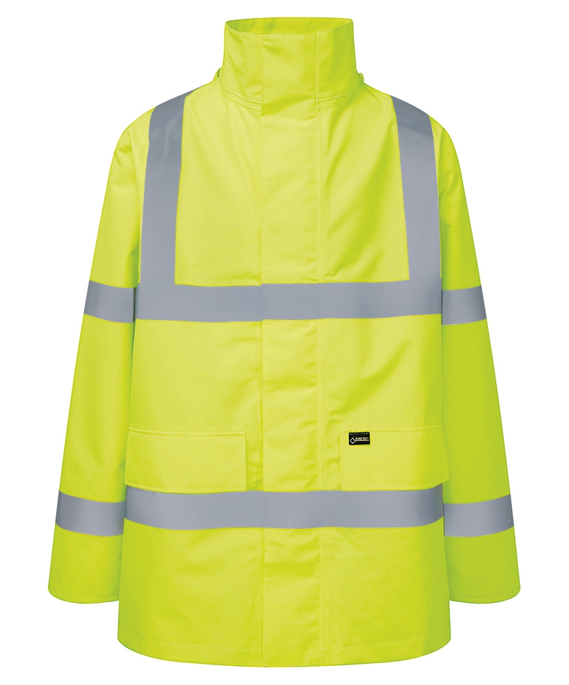 Full-length zip and storm flapTwo patch pockets three internal pocketsDouble band and reflective braceConforms to EN471 Class 3 and EN343 Class 3Up to 40° washWaterproof windproof fully breathable Gore-tex fabric