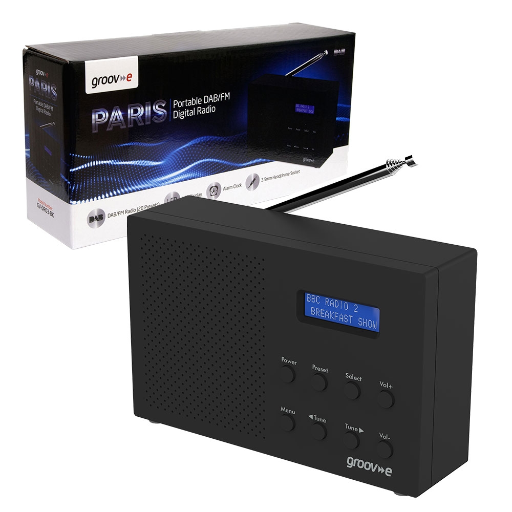 Supplied brand new in sealed retail packaging complete with a 100~240V mains unit (UK 3 Pin plug fitted). Ideal for Worldwide use. This portable alarm clock radio / FM and DAB radio will make a great addition to your home or workplace with its clean cut rectangular design, sleek casing and stylish look. It has all the features you need in a radio alarm clock and its size means it fits neatly on a bedside table or shelf but is still portable and will fit easily into a suitcase or bag when you’re travelling.The portable DAB radio can be used anywhere in the home or if you’re on the move it’s an ideal companion. Lightweight and easy to carry, you can take it with you on your travels using batteries or with the mains power adapter can be used at home. The versatile clock and neat, functional button controls make this a perfect companion whatever you’re doing and wherever you want to listen – Up a mountain or just in the park etc.With 20 presets (10 DAB and 10 FM stations) plus auto or manual scan tuning facility you won’t be short of listening choices and the backlit LCD display with radio text feature keeps you informed of what’s going on. The clock shows both time and date and the alarm feature can wake you with either radio or buzzer – the choice is yours. It even comes with a snooze and sleep timer so you’re always in control. No need to oversleep with all these functions available!The Paris DAB radio comes with everything you need for simple and trouble-free use. The AC mains cable (supplied with UK 3 Pin plug) powers the unit when at home or at work etc. but if you’re on the move you can fit 4x AA batteries (not supplied) so you’ll always able to listen to your favourite station. An adjustable telescopic antenna helps get perfect reception and the 3.5mm headphone socket enables private listening with your own headphones if you (or your companions!) prefer.DAB/FM radio20 Preset StationsBacklit LCD DisplayClock with Dual Alarm3.5mm Headphone SocketRadio textAuto & manual scan tuningSnooze & sleep timerTelescopic antennaAC Mains power unit – accepts 100~240V so is ideal for Worldwide Travel!Requires 4 x AA batteries for portable uses (not included)Unit Dimensions: (H)9.5cm x (W)14.9cm x (D)5.0cm;Unit Weight: 0.024kg