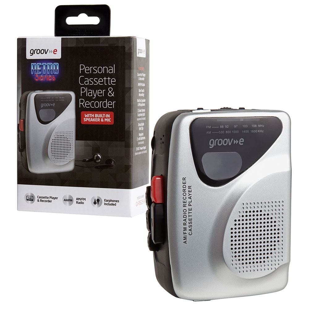 Supplied brand new in sealed retail box. Go back to basics with the Groov-e Personal Cassette Player and give yourself an excuse to the old tapes down from the attic.The Groov-e Personal Cassette Player will let you listen to your favourite cassettes out loud through the external speaker or listen privately through the included earphones. Or why not use the built-in radio to listen to your favourite FM and AM stations whilst on the go or relaxing at home?Thanks to an integrated microphone and one-touch recording, you can also use the Cassette Player as a voice recorder.The Groov-e Cassette Player is powered by 2xAA batteries (not included) or a Micro-USB input (cable not included).