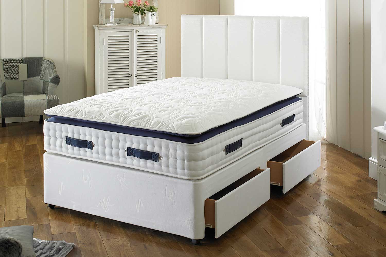 The Joseph Marina Pocket Series 2000 Memory Foam Pillow Top Divan Bed is a luxury addition to the Joseph collection of pillow top mattresses and divans. This sumptuous mattress features a high count pocket spring unit. Each single spring is able to move and react to your bodies own movement to ensure top quality support for your whole body. A luxurious deep layer of memory foam sits on top of the springs which naturally moulds to your body to enhance spinal alignment. Wool fillings complete the pillow top mattress to complete the luxury feel. The 12 inch deep mattress is finished a soft touch quilted top, breather vents, mattress handles and a side stitched border.