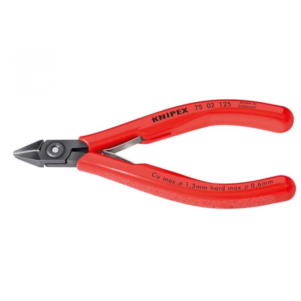 The Knipex 75 02 125 extra slim diagonal cutters are constructed from solid style forged top quality steel with precision non-slip tips for added strength and durability. With high quality material and precise workmanship for long service life. Clean cutting at cutting edge tips for hard or soft wire or thin copper wires. With narrow head style for use in confined areas. Like most of the Knipex range of pliers, all components have oil hardened edges and hardened electric steel forged to approximately 64 HRc. They are ideal for cutting soft wire close to a flat surface with the bevelled blade. The cutters have a hardened head and plastic PVC coated cushion grip handles for added durability and comfort. Length: 125mm.Cutting Capacity: Piano: 0.4mm, Hard: 0.6mm, Medium: 1.0mm, Soft: 0.2-1.3mm.