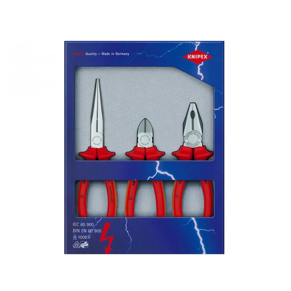 This Knipes KPX002012 is a 3 piece VDE protected set of pliers and the set contains: KPX0306180 combination plier. The cutting edges are ideal for hard and soft wire. They are oil hardened and tempered, and then separately induction-hardened. These 180mm Knipex 0306180 combination pliers have chrome-plated heads for smooth operation and handles with heavy-duty insulation for a softer and more positive grip. These Knipex pliers have been VDE tested up to 1,000v, have gripping zones on the head jaws for flat and round material and are suitable for versatile use on almost any job application. The Knipex KPX2616200 200mm long nose side cutters have long flat round jaws that are highly loadable, with elastic precision points with blades for hard wire diameter 2.2mm and medium wire diameter 3.2 mm. The cutting edges are separately induction hardened for durability and longer working life, also the edges are hardened to approx 61HRC. Knipex have used a good quality special tool steel material, that is oil hardened and come with two component heavy insulated handles, are VDE tested to 1000v and are 200mm 8-Inch long. Ideal for all electrical instillation applications. KPX7006160 diagonal cutter pliers are made from a top quality vanadium electric special tool steel, forged and oil-hardened to approximately 62 HRc for added strength and durability. The cutting edges are ideal for hard and soft wire. They are oil hardened and tempered, and then separately induction-hardened. The Knipex 7001610 160mm diagonal cutting pliers have chrome-plated heads for smooth operation and handles with heavy-duty insulation for a softer and more positive grip. These pliers have been VDE tested up to 1,000v and are suitable for versatile use on almost any job application.