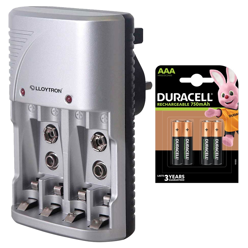 EXTRA VALUE PACK: The Lloytron Compact Plug-In Battery Charger allows you to charge rechargeable batteries from your 3-pin 240v mains socket. You can charge AA or AAA batteries 2 or 4 batteries at a time it can even charge 1 or 2 x 9V ‘PP3’ batteries. With it’s gentle trickle charge (AA=200mA, AAA=200mA, 9v=20mA) you can be confident the batteries will be charged at a steady rate. this Bundle includes 4 brand new (retail packed) Duracell AAA 750 mAh rechargeable DURALOCK batteriesThis conveniently sized charger has an Automatic Short Circuit and Reverse Polarity Protection and an overcharge protection which should provide a trouble free performance over a long period of time. Approx Charging Times AA 1600mAh – 8 hours AA 2100mAh – 11 hours AAA 800mAh – 4 hours 9v 250mAh – 13 hours Lloytron provide a 1 Year Warranty