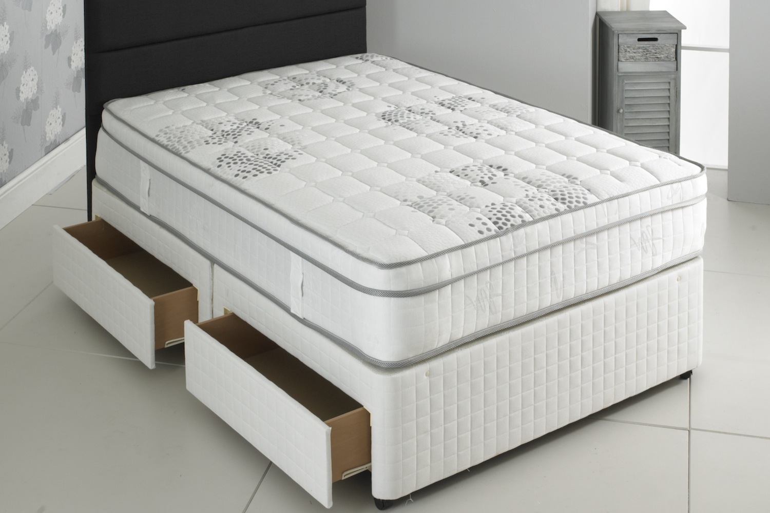 The Oasis Pocket Spring Series 2000 Pillow Top Divan Bed has individually pocket springs. Utilising stiffer springs and other toughening fillings it is an orthopaedic mattress that will ensure a fantastic sleeping domain. Finished with luxurious fabric, this mattress also has vents that allow the mattress to breath, which helps to promote a good night’s sleep and make the mattress last many more years in health and freshness. The divan base is available with storage in multiple options. This mattress will provide countless night’s of good sleep and will remain supportive for the many years to come.