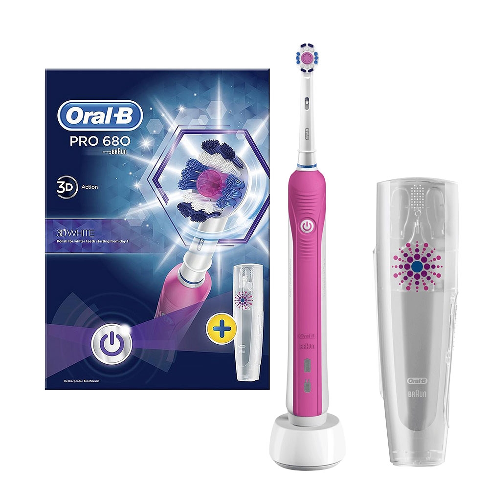 Achieve a clinically proven superior clean vs. a regular manual toothbrush and whiter smile with the Oral-B Pro PRO 680 Pink 3DWhite electric toothbrush. The specialized cup polishes for whiter teeth starting from day 1 by removing surface stains and the round dentist inspired toothbrush head oscillates, rotates and pulsates to remove more plaque vs. a regular manual toothbrush. Together with the daily clean cleaning mode and an in-handle timer to help you brush for a dentist recommended 2 minutes, the Oral-B Pro PRO 680 Pink 3DWhite is a superior solution for your personalized brushing needsIncluded in pack: Rechargeable toothbrush handle, Charging station UK 2-pin plug, Travel Case, 1 3D White brush head