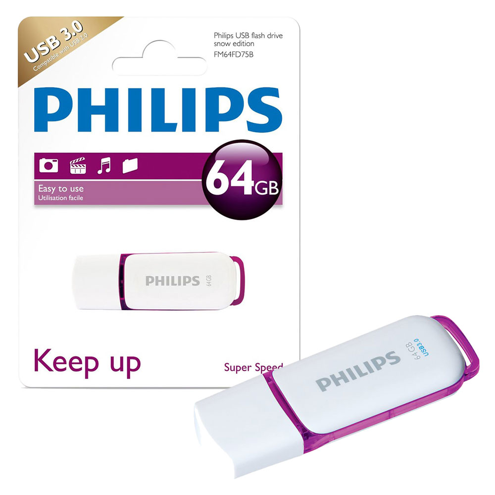 The stylish Philips USB flash drive stick snow edition makes your daily storing and sharing of files, photos and music easy and affordable.It’s easy to use plug and play, while high-speed data transfer rates can significantly cut annoying time waiting around when copying large multimedia files to or from your computer’s hard drive. This USB stick features fast USB 3.0 technology and is compatible with USB 1.1 and 2.0).With 64GB capacity, there’s lots of room for your files – so you can swap, share and save much larger or more files via the USB port of your PC or laptop. You could store approximately 12,832 10 megapixel photos or 16,672 4 minute songs or up to 16 Full HD 1080p (6 Mbps) 90 minute movies approx*.SpecificationsProduct: USB flash drive memory stickCapacity: 64GB* Super-speed USB 3.0 (compatible with USB 1.1 and 2.0)Super-speed USB 3.0 (compatible with USB 1.1 & 2.0)Reads up to 120MB/sWrites up to 20MB/sDimensions: 59 x 20 x 9mm (length x width x thickness)Activity indicatorSystem requirements: PC OS – Windows Vista, XP, 2000, ME and 98SE; Mac OS 9.0 and higher, Linux 2.4.0 and higher*Some capacity is used for formatting & other functions. 1GB = 1,000,000,000 bytes. Some operating systems measure GB differently, so capacity may appear less. Speed may vary with operating conditions.