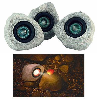 Three 10w halogen low voltage lights that can be used under the water or in the garden. Quality lights set into a lifelike stone casing. All three lights run off a single 12v safety transformer(only one outlet necessary for mains). Brought to you by the premier manufacturer Oase under their ‘Pontec’ brand.