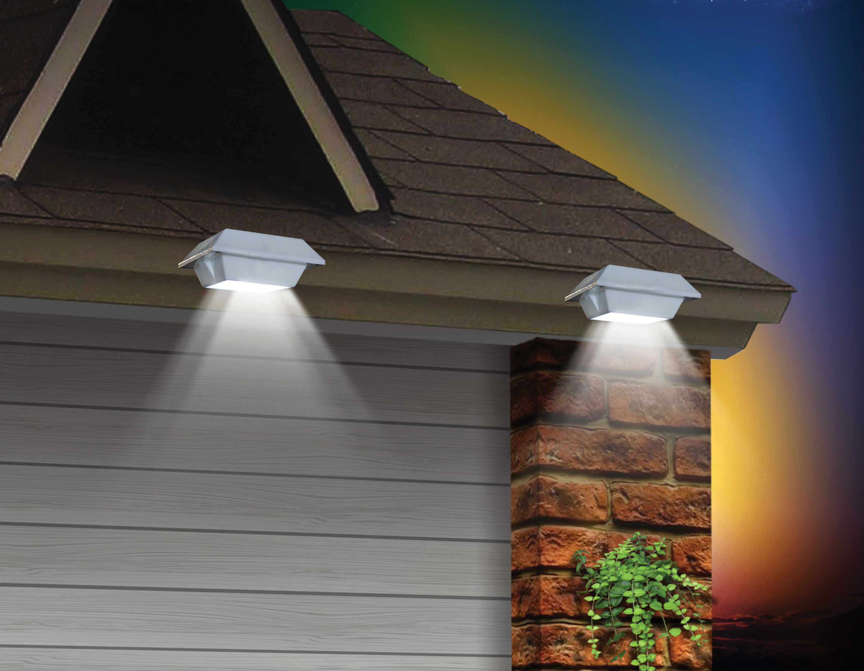 This pack of 2 square LED solar gutter lights made from durable plastic is perfect for use on low level guttering. Ideal for garages, porches, conservatories, sheds and fences. They provide welcome bright light from dusk till dawn. They simply clip into place and are secured with the mounting brackets and screws supplied. Each unit has built-in polycrystalline solar panel, and is fitted with four bright white LED’s and powered by two 1.2V 300mAh NI-MH rechargeable batteries supplied. On-Off switch. Fixings Included. Overall size: 12 x 12 x 5cm.