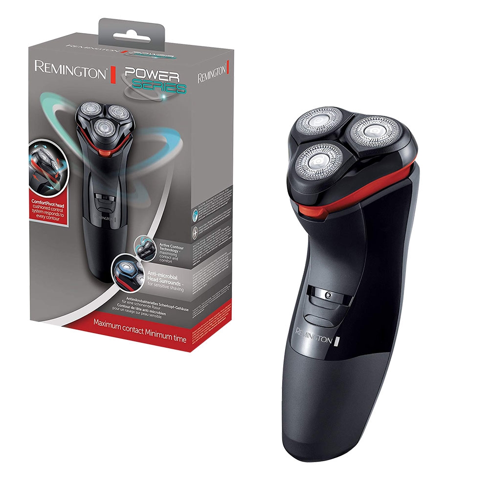 Get a closer, more comfortable shave with our the Remington Power Series rotary shaver. Plus, the Antimicrobial Head Surrounds, with the flexing 3 individual cutter heads, adapt comfortably to provide a clean, sensitive shave. With its sleek design, the Power Series is the perfect upgrade to any shaving session and especially great for those prone to irritation. Our Precision Engineered Steel Blades and pop-up ComfortTrim trimmer allow you to add the finishing touches, and leave no hair behind for a clean cut look – maximum contact, minimum time. *Vs. standard Remington rotary range **Vs. single track rotary shaverModel number: PR1330.1 cutting length .Corded use.For dry use.Rotary system.Not washable.1 shaving head included.Head guard.Pop-up trimmer – perfect for sideburns and moustache.Accessories included: headguard.General information:Accepts 100~240V for Worldwide use for easy use around the globe.Mains powered. – fitted with a standard 2 pin shaver plugManufacturer’s 2 year guarantee.EAN: 4008496877027.Please note this shaver is mains powered only not cordless