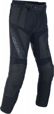 Top quality cow leather Ballistic polyamide & stretch aramid panels Polyamide lining Knee protectors EN1621-1:1997 2-layer removable breathable Humax Membrane® with a water column of over 10.000 mm Trousers can be worn over or in boots Long & short connection zipper to attach jacket & trousers to each other Waist adjustment (velcro) Knee protectorsâ position is vertically adjustable