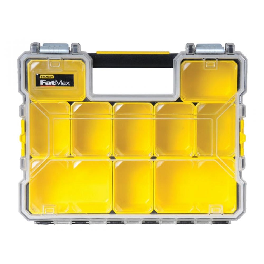 This Stanley FatMax Professional Organiser is ideal for storing and organising small parts and accessories, such as fixings, nuts, bolts etc. It is supplied with 10 removeable storage cups for easy access, allowing individual cups to be conveniently moved to where needed, without having to have the whole organiser near by – ideal for situations where space is limited. The transparent polycarbonate lid allows easy location of contents and locks components in position, to stop the cups sliding around. Side latches allow multiple organisers to be clipped together for easy transportation. It has plastic catches. Dimensions: Height: 7.4cm. Width: 35.7cm. Depth: 44.6cm.