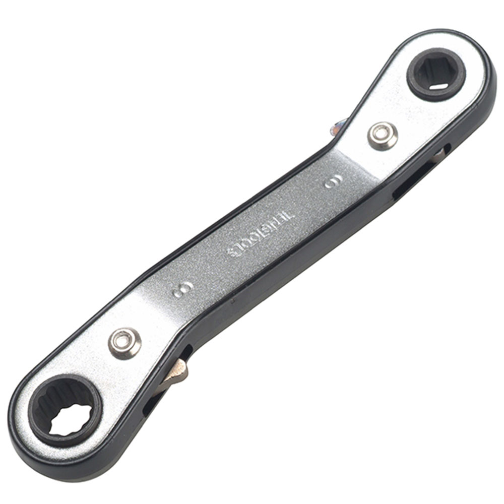 A reversible ratcheting ring spanner, offset at 25° with sizes paired to suit common applications. Ideal for use on flat surfaces and long threaded bolts. Manufactured from chrome vanadium steel with a satin finish.Size 6 x 8mm.Length 112mm.