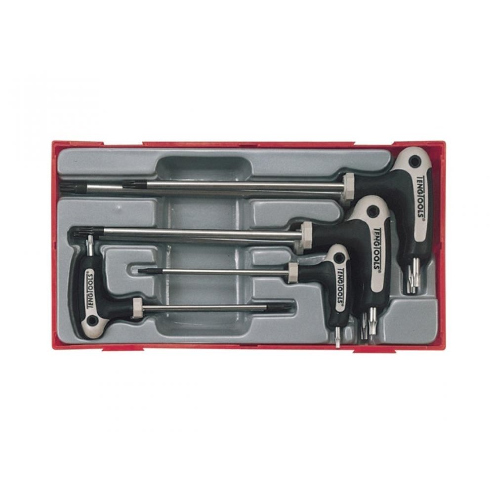 This Teng Tools Torx keys with T handles, each have a short arm and a long arm. The short arm allows excellent leverage allowing easy tightening and loosening and also has a slot to work on tamperproof screws. The long arm allows access to more difficult to reach areas. The keys are made from Chrome Molybdenum alloy steel for extra strength. This 7 piece set of Torx keys for internal TX heads consists of the following sizes:3 x 100mm TX/TPX keys (TX/TPX10, TX/TPX15 and TX/TPX20). 3 x 150mm TX/TPX keys (TX/TPX25, TX/TPX27 and TX/TPX30). 1 x 190mm TX/TPX key (TX/TPX40). Supplied in handy storage tray.