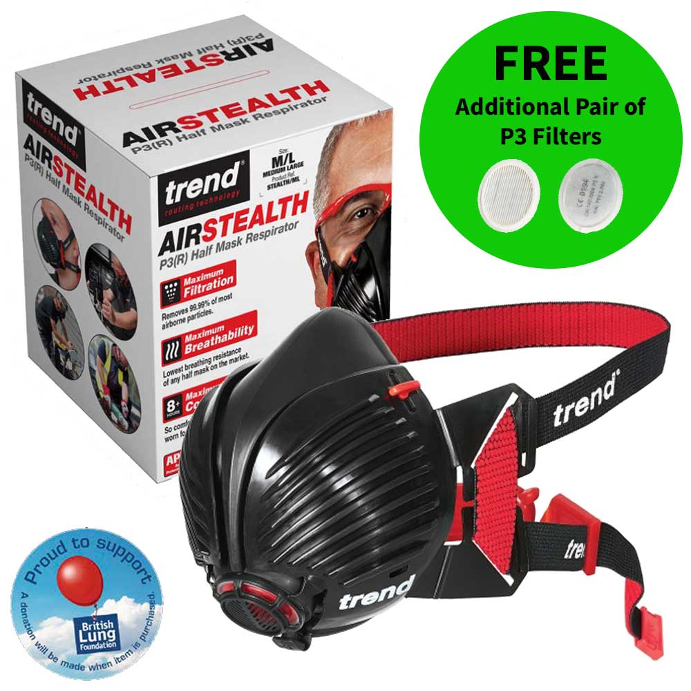 The Trend Air Stealth Half-Mask protects the user against Airborne Particles, Oil Aerosols, Mist, Welds & Fumes. It is fitted with a Twin HEPAC pleat encapsulated filter, that provides 99.99% filtration of Airborne Particles & Aerosols at 0.3 micron and above. The Exhalation Valve is located at the bottom of the face piece, and this helps to prevent exhalation fumes steaming or fogging glasses / visors. The Protective Grill covers 100% of filter surface, protecting the filter from moisture and particulates, ensuring it performs better in clogging pressure and filtration efficiency. Specification: Weight : 131g Size : Small / Medium Assigned Protection Filter : BS EN143 P3R Conforms to Half-Mask Standard : BS EN140 This Product Includes: 1 x Pair of P3 Filters (Standard) 1 x Additional Pair of P3 Filters (Promotional) Please Note: This product is not for use with asbestos.