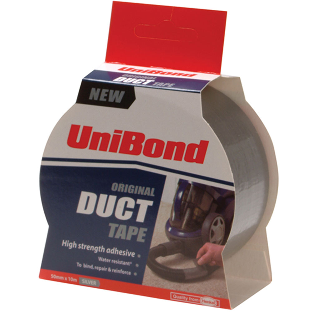 Unibond Duct Tape is a multi-purpose, heavy-duty, fabric reinforced tape. It uses a high strength adhesive for a long-lasting hold. The tape is water-resistant and ideal for binding, repairing and reinforcing. It adheres to multi-surfaces. This heavy-duty adhesive tape has hundreds of uses around the home, car and garden and is suitable for both interior and exterior use. No need for scissors as the tape can be easily torn by hand.Size: 50mm x 50m. Colour: Silver.