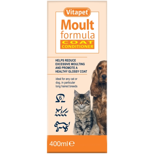 Vitapet Moult Formula Coat ConditionerVitapet Moult Formula is a unique blend of natural oils rich in Omega-6 fatty acids to help reduce excess moulting and promote a healthy, glossy coat.Moulting is a natural process, however central heating and poor nutrition can upset a dog’s natural moulting cycle, causing excessive moulting. This can cause embarrassment in coping with unsightly hairs around the home. Research indicates that dietary supplementation with omega-6 fatty acids can help reduce excessive moulting by replenishing the natural oil levels in the body.As well as helping to protect a healthy glossy coat from the outside elements, Vitapet Moult Formula also promotes nutritional good health naturally from the inside. Enriched with vitamins A, D and E, it supports good vision, strong bones and teeth and a healthy immune system.Vitapet Moult Formula is ideal for all dogs over the age of 12 weeks, particularly long hair breeds and bitches in whelp.DirectionsMix daily with food.Adults:Small Breeds under 5kg: 2.5-5mlMedium Breeds 15-25kg: 5-7.5mlLarge Breeds 25-35kg: 7.5-10mlVery Large Breeds 35kg+: 10-15mlPuppies: At the start of weaning add a few drops into the mouth. When weaned increase to 10ml per 500g of dry type food.Bitches in Whelp: Use the adult amount twice daily.