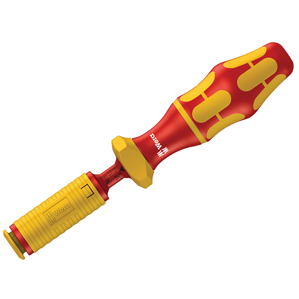 Wera VDE Adjustable Torque Screwdriver is ideal for electrical applications and ensures safe work on components with loads up to 1,000 volts. Conforming fully to EN60900:2004, this tool is individually tested to 10,000 volts. The screwdriver allows simple and fast torque adjustment and produces a distinctly audible and noticeable excess load signal when the pre-set value is exceeded. It can be set to unlimited torque for manual loosening jobs and its accuracy meets the requirements of ISO 6789 (±6% for tools up to 10 Nm). The screwdriver’s Kraftform handle is ergonomically designed to provide comfort and has hard gripping zones for excellent torque transfer. It is suitable for use with Kraftform Kompakt VDE interchangeable screwdriver blades, via an easy press-in auto-lock method and simple release. Specifications: Torque Range: 1.7-3.5Nm.Accuracy: ± 6%.