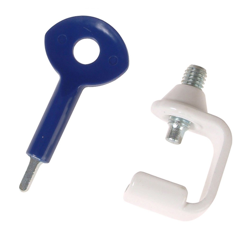 The Yale P121 is a window stay clamp in a white finish and is designed for metal casement window frames. The main feature is that it simply secures over the metal stay bracket and screws into the hole on the arm, thus preventing movement of the arm when the window is opened for ventilation or in the closed position at night for added security. Simply use the universal key supplied to lock and unlock. Finish: White1 x Key